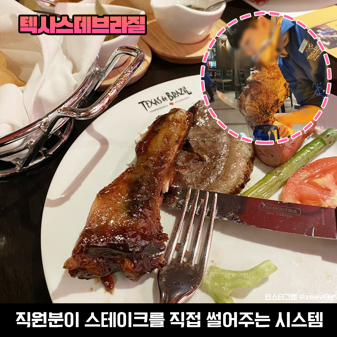 우리가 직접 가져다 먹는 건 Only 샐러드바! 직원분이 테이블마다 돌면서 스테이크를 직접 썰어주는 카빙 서비스가 제공되거든요. 런치의 경우 9종, 디너는 15종의 슈하스코를 맛볼 수 있어 쉴틈없이 먹어줘야 한다구요.♥