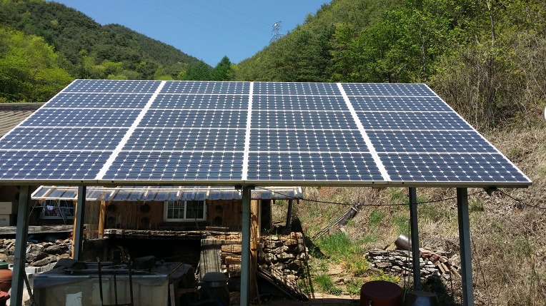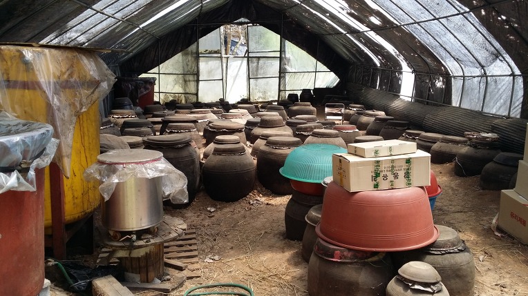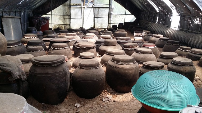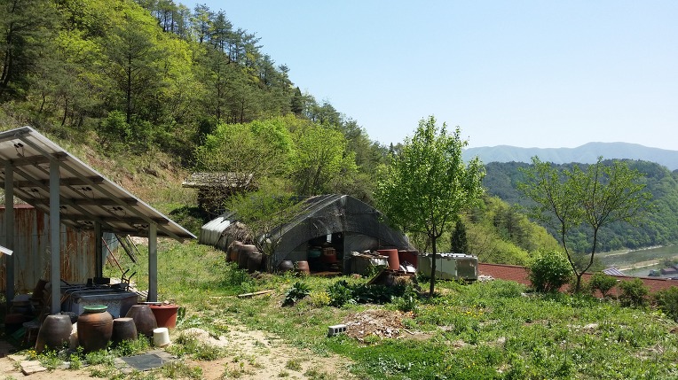 왼쪽에 태양열 집열판, 우측 비닐하우스가 전통 효소 담그고 보관하는 장소