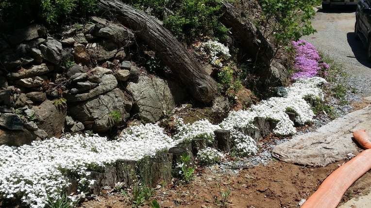 부지 주변 자연석과 고목으로 만든 천연자재 정원입니다